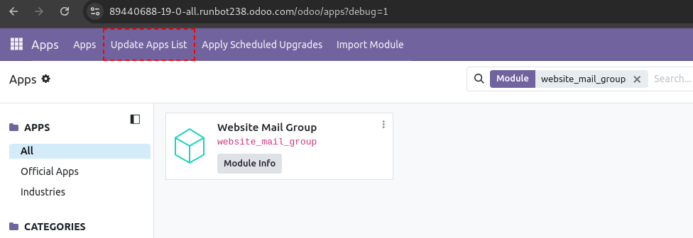 and wanted to install website_mail_group. I have the free online version and activated the developer settings, but website_mail_group is not listed in "apps".