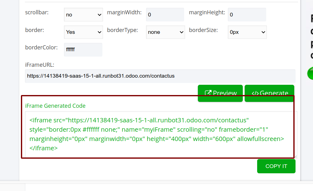 If you copy/paste the URL of the Odoo page in the IFrameURL, it will generate an HTML code to embed in any website.