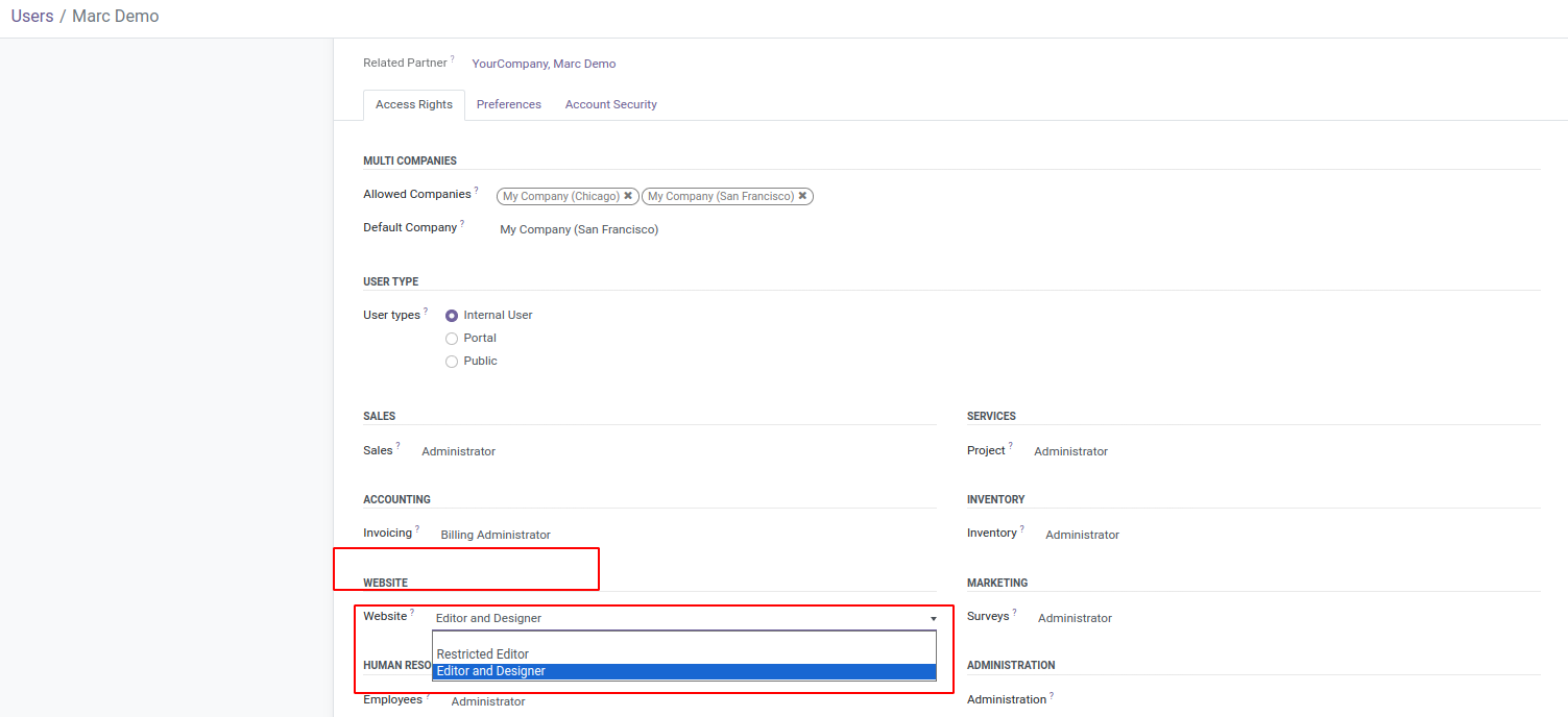 If you need to edit the website. The user need to have the Editor and designer access rights To provide access rights go to settings -> users & Companies -> Users